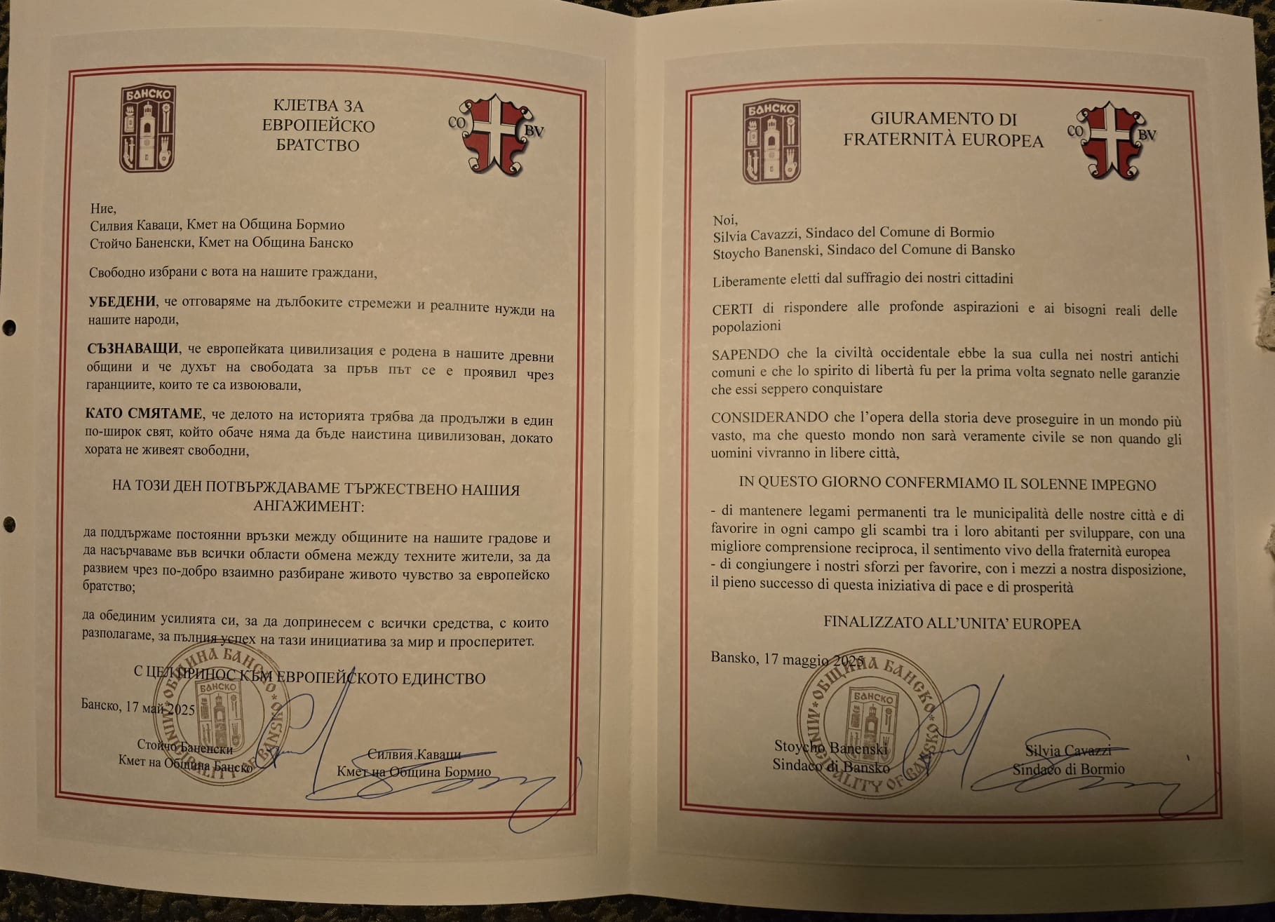 Миналия уикенд, в присъствието на посланика на Италия в България Марчело Апичела, в община Банско се състоя церемония по подписване на споразумението за побратимяване между общините Банско (област Благоевград) и Бормио (градче в област Ломбардия, провинция Сондрио, в сърцето на Алпите и Алта Валтелина). Побратимяването е кулминация на ангажиментите, поети от двете общини по инициатива на почетния консул на България в Ломбардия Марко Кампанари в сътрудничество с посолството на Република България в Рим. По време на церемонията беше подпечатана „Клетвата за европейско братство“ между двете общини.