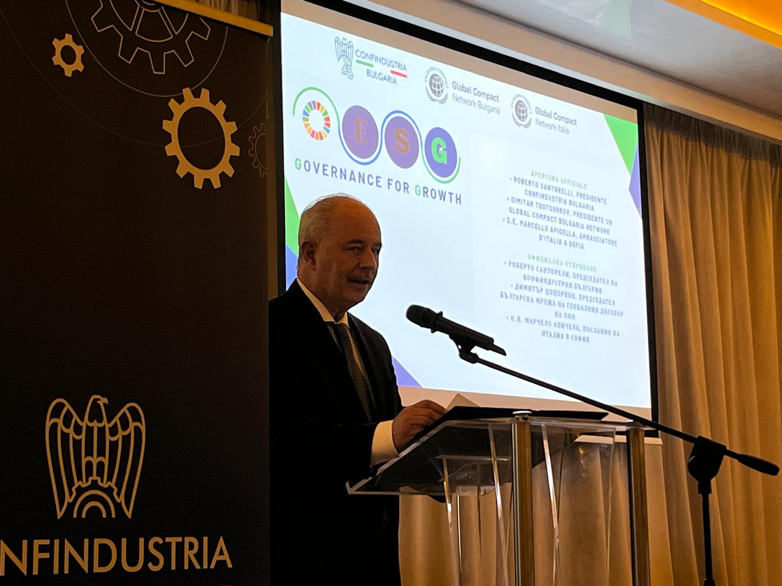 На 1 октомври посланикът на Италия в София Марчело Апичела говори по повод второто издание на Международната конференция „ESG: Трансформиращо управление за растеж на бизнеса“, организирана от Конфиндустрия България с подкрепата на Посолството на Италия в София и в сътрудничество с Българската и Италианската мрежи на Глобалния договор на ООН, която се проведе в хотел Интерконтинентал в София.